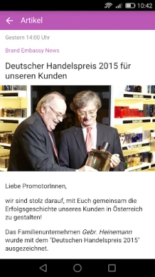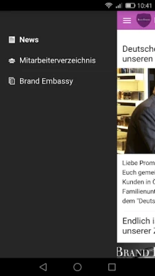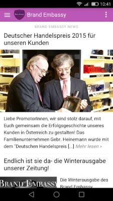 Die Brand Embassy Promotionagentur GmbH (www.brandembassy.at) stellt Mitarbeitern, Kunden und Partnern eine App zur Verfügung. Diese App enthält allgemeine Informationen, Arbeitsanweisungen, sowie spezielle Informationen zu Promotions/Projekten (z.B. Schulungsunterlagen). Auch Personalveränderungen sowie Reviews zu abgeschlossenen Promotions werden hier veröffentlicht.